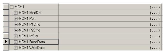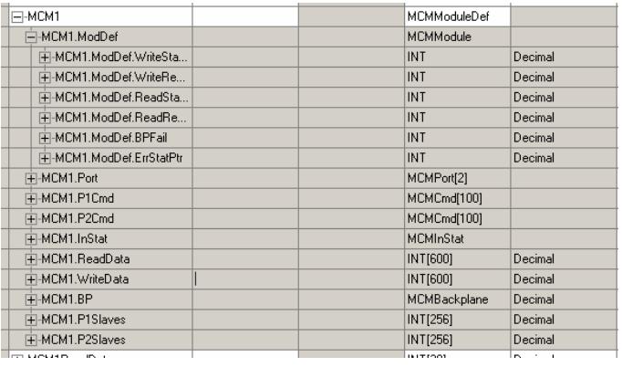MCM1.ReadData: 讀數據區。一個從 Master 設備寫到作為 Slave設備的通訊口,或從 Slave設備讀取的數據。這個位置的數據是從 MVI56-MCM模塊返回到ControlLogix處理器的。 MCM1.WriateData: 寫數據區。位于 MCM1.WriteData中的數據是 ControlLogix處理器的信息及需要寫到模板的內部數據庫的信息。包括寫到 Slave設備的信息(設為 Master時),或寫到模板的信息(當口組態為 Slave時)。