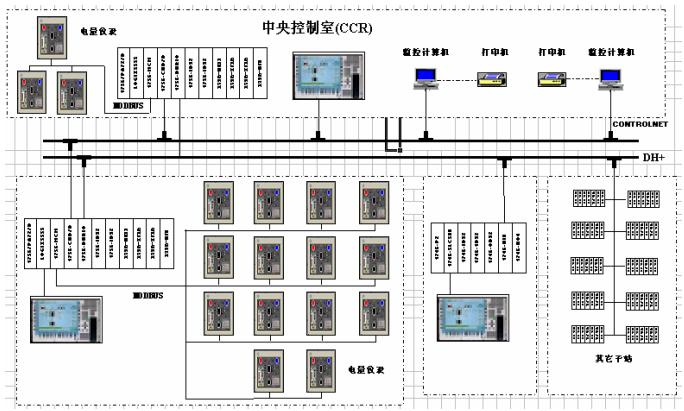 摘要: 整個廠區的自動化控制由7個PLC站組成。全部采用了羅克韋爾自動化的PLC,通過CONTROLNET與中控室進行通訊。全廠的通訊采用LOGIX5000系列的DHRIO模板將 DH+網的數據采集后由CONTROLNET傳送到中控室計算機。計算機監控系統由羅克韋爾自動化公司的RSVIEW組成,負責整個廠區的設備監控及報警。由MVI56- MCM模塊將輸出設備的電流,電壓及功率這些電量數據傳輸到PLC。