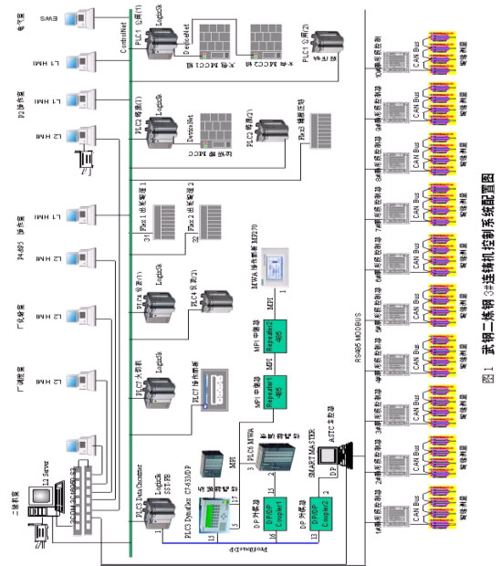 本項目的控制平臺為美國羅克韋爾自動化公司ALLEN-BRADLEY Logix5000,主體網絡CONTROLNET,設備網DEVICENET+Profibus+Modbus,分布式I/O FLEX 1794+Canbus。運行RSView32系統畫面的PC機通過1784-PCIC(S)專用網卡連入CONTRETNET,單機運行版。系統配置圖如圖1所示。其中三臺L1 HMI和一臺EWS為運行RSView32系統的PC機。