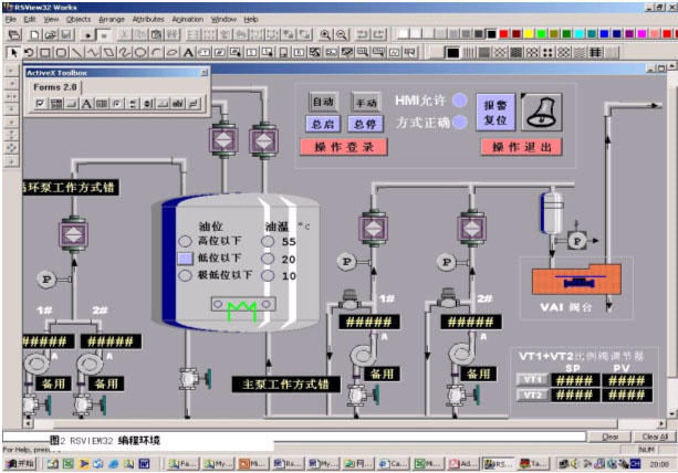 評判一個可視化平臺的性能時不能閉而不談其是否易學易用。這對自動化應用人員尤其重要。一個優秀的平臺應能使編程者盡快上手,迅速掌握,而不是花很多時間去培訓或自學。在這個可視化平臺之上,他(她)根據以往的工作經驗和閱歷,把更多時間和精力置于應用程序的設計和二次開發上。RSView32系統編程概念和開發環境簡單易懂,便于自學。結合學習隨RSView32系統安裝盤一道提供的Samples程序,可解決諸如標簽定義、繪圖、動畫處理、趨勢顯示以及報警/事件記錄等一般畫面應用問題。圖2為RSView32系統編輯窗口。