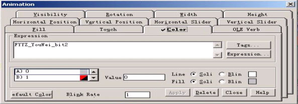 動畫顯示是控制系統監控畫面中的一個重要內容。具不完全統計,80&以上的輸入點有動畫顯示的需求。例如開關量輸入標簽的報警,以填充圖形表示模擬量變化等等。RSView32系統將對象常用的動畫顯示歸納為隱藏(Visibility)、變色(Color)、填充(Fill)、水平移動(Horizontal Position)、豎直移動(Vertical Position)、變寬(Width)、變高(High)、旋轉(Rotation)、觸摸(Touch)、水平滑條(Horizontal Slide)和豎直滑條(Vertical Slide)共11大類,全部集成在動畫編輯窗口內,如圖5所示。一般情況下,動畫顯示受控于表達式欄內填入的標簽值。最常用的例子,如圖5所示,就是根據標簽值改變對象的顏色和閃爍屬性。同一對象可以同時使用兩種以上動畫顯示,控制標簽可以是一個,也可以是多個。例如液壓泵組操作方式出錯的提示字域,當方式未出錯時將其隱蔽。出錯時顯示并閃爍報警。
