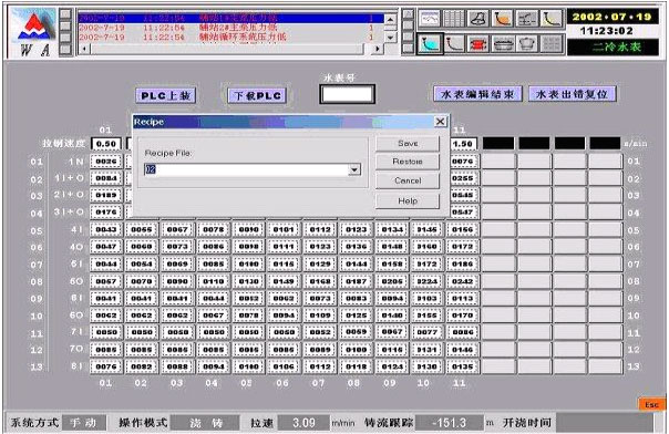 二次冷卻水表是連鑄過程重要的工藝參數。二冷水表為各扇形段的冷卻水調節回路提供設定值,是多組常數的集合。使用時一般根據不同的鋼種,在RSView32系統環境內從畫面PC機的硬盤中將對應的水表調至內存并在畫面上顯示,必要時予以修改后再下裝至PLC。修改后的水表還要存回硬盤。換言之,水表操作顯示任務要求批量數據在PC機硬盤、內存和PLC三地之間進行移動。在程序中引用Recipe控件使這一控制任務異常簡單,如圖8所示。