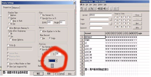圖9和圖10分別為畫面安全級別和用戶操作權限的設定窗口。