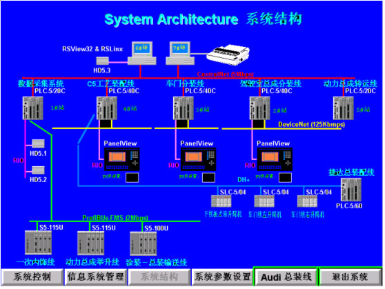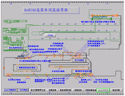 一汽大眾總裝車間實時監控系統是用于控制整車車身工藝裝配線及各個分裝線的實時監控系統,它的主要功能是對整車裝配生產進行監控.該系統采用美國羅克韋爾自動化公司的RSVIEW32工業監控圖形組態軟件制作而成。該組態軟件運行于WINDOWS95以上操作系統平臺,共分為以下幾部分:實時顯示部分;故障報警部分;信息查詢管理部分;梯形圖,CAD圖輔助診斷部分;系統運行參數設定部分等等。該系統的控制部分還采用了網絡控制技術及現場工業總線技術,其中包括:ControlNet, DeviceNet , Fieldbus, EtherNet等. 該系統的優點是能夠直觀迅速地反映生產現場的實際情況,可以在中央控制室對生產線遠程進行起動/停止控制,同時可以調出各個子模塊的梯形圖對其進行編輯/調試,它還具有故障顯示/查找功能.根據中德雙方股東(第一汽車集團公司和德國大眾股份公司)的戰略規劃要求,轎車一廠的生產能力于今年10月要達到年產三十三萬輛,即兩條總裝生產線要同時進行混流生產,AUDI B6和AUDI C6混流生產線實現生產節拍4分鐘/輛,而JETTA/BORA/GOLF生產線實現節拍85秒/輛,并且兩條裝配線均是按照三班生產,300工作日/年計算.