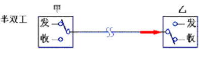 圖1 比如,計算機主機用串行接口連接顯示終端,而顯示終端帶有鍵盤。這樣,一方面鍵盤上輸入的字符送到主機內存;另一方面,主機內存的信息可以送到屏幕顯示。通常,往鍵盤上打入1個字符以后,先不顯示,計算機主機收到字符后,立即回送到終端,然后終端再把這個字符顯示出來。這樣,前一個字符的回送過程和后一個字符的輸入過程是同時進行的,即工作于全雙工方式。 2、半雙式方式(half duplex) 若使用同一根傳輸線既作接收又作發送,雖然數據可以在兩個方向上傳送,但通信雙方不能同時收發數據,這樣的傳送方式就是半雙工制,如圖2所示。采用半雙工方式時,通信系統每一端的發送器和接收器,通過收/發開關轉接到通信線上,進行方向的切換,因此,會產生時間延遲。收/發開關實際上是由軟件控制的電子開關。