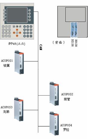 (1)主控制系統(tǒng)采用PP41系統(tǒng),驅(qū)動系統(tǒng)采用ACOPOS多功能驅(qū)動器,CAN bus(500k傳輸速率)總線控制方式;