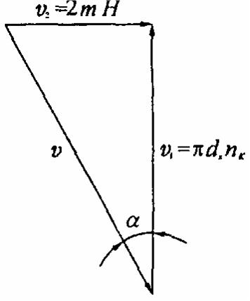又由于卷繞速度v(其單位為m/min)與卷裝表面圓周速度v1、橫動(dòng)導(dǎo)絲速度v2之間可構(gòu)成一個(gè)如圖l 所示的卷繞速度矢量圖(圖中的a 為卷繞角、m 為導(dǎo)絲機(jī)構(gòu)每分鐘往復(fù)次數(shù)),于是對(duì)應(yīng)于tx的錠軸轉(zhuǎn)速nK (其單位為r/min)的某一值為: