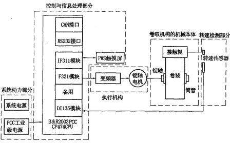 在具體實(shí)現(xiàn)式(5)所要求的檢測(cè)、計(jì)算和控制任務(wù)時(shí),可應(yīng)用PCC 控制技術(shù)按圖2 的示意設(shè)計(jì)成為如圖3 所示的一種錠軸傳動(dòng)卷繞機(jī)機(jī)電一體化的PCC 控制系統(tǒng):紙質(zhì)筒管上繞有卷裝,卷裝上有施加一定接觸壓力的接觸輥,接觸輥的實(shí)際轉(zhuǎn)速由其對(duì)應(yīng)的轉(zhuǎn)速傳感器檢測(cè)拾取,裝有紙質(zhì)筒管的錠軸由錠軸電機(jī)直接傳動(dòng),錠軸電機(jī)通過(guò)其變頻器調(diào)速,整個(gè)系統(tǒng)的核心部件是PCC 。圖3 中的PCC 選用了奧地利貝加萊工業(yè)自動(dòng)化公司B&R2000PCC 系列B&R2003PCC 及其模塊化擴(kuò)展技術(shù),它主要由B&R2003PCC 子系列中的CP474CPU 主模塊、DI135 高速數(shù)字量輸人模塊、IF321RS485 接口模塊和IF3llRS232 接口模塊等組成。