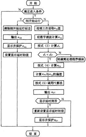 圖5 所示的為過(guò)程控制處理程序流程圖,它是以函數(shù)關(guān)系式(4)為主要參照物,通過(guò)檢測(cè)拾取n 計(jì)算求出e ,按式(5)的PI 算法得出n ,經(jīng)變頻器調(diào)速,使錠軸轉(zhuǎn)速按照式(4)的目標(biāo)函數(shù)運(yùn)行,直至到達(dá)卷裝滿(mǎn)筒外徑d 為止,從而實(shí)現(xiàn)對(duì)錠軸傳動(dòng)電機(jī)的閉環(huán)實(shí)時(shí)控制。