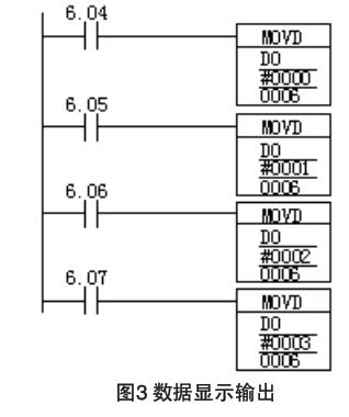 采用MOVD指令,將要顯示的內(nèi)部數(shù)據(jù)如DM區(qū)、W區(qū)、T/C區(qū)等中的一個字通過通道6顯示出來。如圖3所示,本例中,依不同的選通信號,將D0中的數(shù)據(jù)通過選擇不同的位進行顯示。