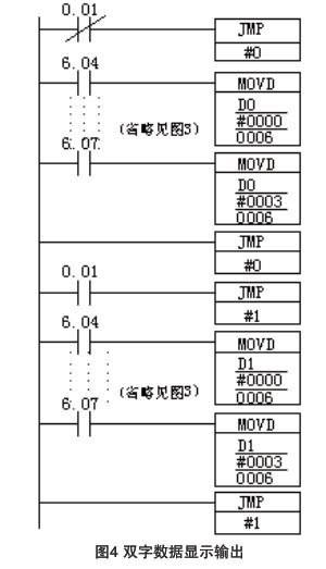 在圖1中,PLC輸入端0.01接撥碼開關(guān)SA,其作用根據(jù)其所在位置不同結(jié)合跳轉(zhuǎn)指令(JMP/JME)來確定數(shù)據(jù)顯示是哪個通道。如圖4中,當SA為ON時,顯示D0中的數(shù)據(jù);當SA為OFF時,顯示D1中的數(shù)據(jù)。