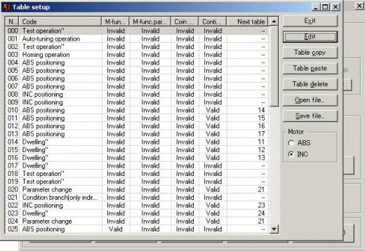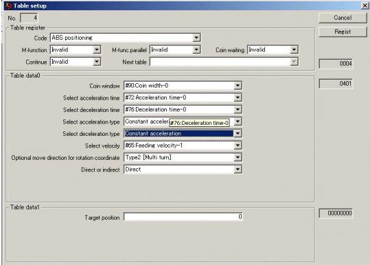橫河GIII驅動器的運行列表有很多種類。可以在內部實現相對位置點到點運行、絕對位置點到點、Homing功能、改變參數等。通過不同的輸入點編碼的切換,就可以運行不同的table號碼,簡單實現運動控制。在DVD光盤制造設備上都是通過table功能實現。橫河GIII驅動器一共有60組table可以進行任意設置與編輯。圖5、圖6為可編寫table列表與table詳細設定。以絕對位置點到點為例子,可以設定加、減速類型、加減速時間,運行速度以及目標位置等參數,以符合設備的要求。