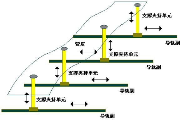 多點成形技術是柔性工裝設計的技術基礎,其基本原理為采用多個均勻離散的點來擬合飛機裝配部件的三維型面,通過精確的數字建模,控制各點的點位來達到精準的控制,使工裝表面完全貼合飛機零件表面。使用這種柔性裝配技術可以使飛機裝配型架的制造周期大大縮短,并可以取代大部分固定裝配型架。同時由于其采用了離散式的點位控制方式,使得該系統具有可重構性,一套該系統可以完成多種表面形狀的零件工裝。 固定飛機薄壁板采用的是行列可移動式動態工裝,其基本元器件為可移動的導軌副以及高度可以調整的支撐夾持單元,以上元器件的控制均通過數控伺服完成,通過伺服的不同位置調整使整個工裝系統按照理論的點位分布,使蒙皮達到理論的工裝外形。