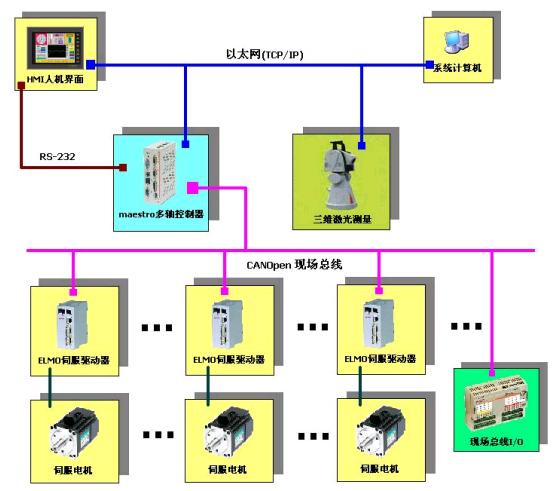 本系統主要包括以下幾個部分:系統計算機主要計算并且給出數學模型;羅升HITECH人機界面可以實時的顯示和設定一些現場的工作參數;三維激光測量可以反饋實際的位置值回當前的系統計算機;羅升引進的以色列Elmo公司的MAESTRO多軸控制器為本運動控制系統的核心,配合 CAN總線上掛接的多顆Elmo公司的伺服驅動器完成對多個點位的位置控制;同時,由于工藝方面需要的夾持等功能,故CAN總線上還掛接有一些現場總線I/O。