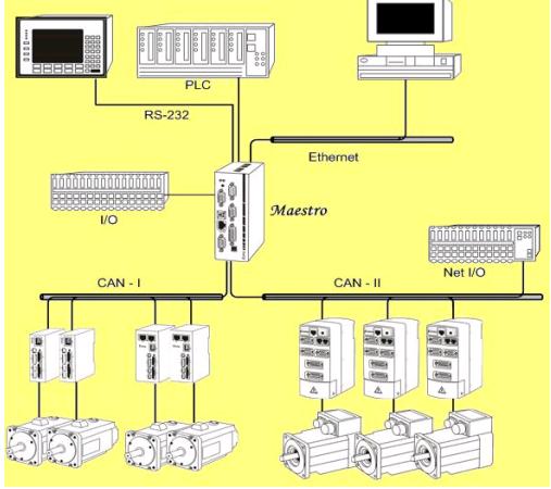 羅升Elmo產品的MAESTRO控制器為一種基于網絡的多軸運動控制器,可以完成2D、2.5D的差補,多個軸的同步以及開始、停止等類似PLC的運動控制功能,同時其在整個系統的通訊層面可以完成的工作很豐富,諸如:網絡的網關;各個節點的狀態的監控;運動的網絡遠程訪問和控制;CAN現場總線的主站等。