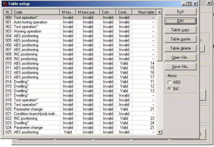 橫河GIII驅(qū)動器的運行列表有很多種類。可以在內(nèi)部實現(xiàn)相對位置點到點運行、絕對位置點到點、 Homing 功能、 改變參數(shù)等。 通過不同的輸入點編碼的切換, 就可以運行不同的table號碼,簡單實現(xiàn)運動控制。LCD 切割設(shè)備上都是通過table date功能實現(xiàn)。橫河 GIII驅(qū)動器一共有60組table可以進行任意設(shè)置與編輯。圖 5可編寫 table列表。以絕對位置點到點為例子,可以設(shè)定加、減速類型、加減速時間,運行速度以及目標(biāo)位置等參數(shù),以符合設(shè)備的要求。