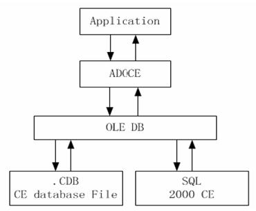 根據實際情況,我們需要保存的信息有時間、IO輸出值、IO輸入值、8通道AD采樣值,根據我們的需要,我們設計ADDIOData數據結構如下。 struct ADDIOData { CString adtime; //采集信息的時間 UCHAR dout; //IO輸出值 UCHAR din; //IO輸入值 float Advalue[8]; //AD采樣值 }; 根據此數據結構,我們實現了創建表和插入記錄的API函數,函數聲明如下: class ADDataBase : public DBManager { public: //函數功能:創建表 //入口參數:tablename表示要創建的表名。 //出口參數:無 //返 回 值:TRUE:創建表成功;FALSE:創建表失敗 bool CreateTable(LPCTSTR tablename); //函數功能:刪除表 //入口參數:tablename表示要刪除的表名。 //出口參數:無 //返 回 值:TRUE:刪除表成功;FALSE:刪除表失敗 bool DeleteTable(LPCTSTR tablename); //函數功能:插入記錄 //入口參數:tablename表示表名,fieldVal為記錄值結構體 //出口參數:無 //返 回 值:TRUE:插入記錄成功;FALSE:插入記錄失敗 bool InsertRecord(LPCTSTR tablename,ADDIOData fieldVal); };二、使用DBManager類及派生類實現創建表、插入記錄等操作的順序為: (1)打開數據庫 (2)創建表 (3)插入記錄 ADDataBase dbm; CString DBFile=_T('\\nandflash\\emtronix.sdf'); CString TableName=_T('ADCollection'); UserInfo test; dbm.OpenDatabase(DBFile); //打開數據庫,參數為數據庫路徑名 dbm.CreateTable(TableName); //創建表 for (i=0;i<6;i++) //每秒鐘采集一次數據 { test.dout=0x01<ISA_WriteUchar(EM9260_CS1,0x10,test.dout); //寫716輸出端口 ISA_ReadUchar(EM9260_CS1,0x10,&test.din); //讀716輸入端口 for (j=0;j<8;j++) { getADValue(j,0,&test.Advalue[j]); //得到8通道AD采樣值 } dbm.InsertRecord(TableName,test); //向tablename表中插入記錄 Sleep(1000); } 由上例可以看出,使用英創公司提供的DBManager的派生類,不必了解數據庫就可以方便地實現數據的存儲。 這種操作數據庫的方式不是十分靈活,對熟悉數據庫的用戶,可以使用DBManager類,執行SQL語句,靈活對數據庫操作。關于DBManager類,可以參考源碼中注釋說明。附錄一、ADOCE簡介 ADOCE(Active Data Object for Windows CE)技術提供了高層數據庫應用軟件的訪問接口,可在eVC、eVB等高級語言環境中直接使用,ADOCE是一種易用的COM組件,關于COM組件的開發與調用在《ARM9工控板在遠程監控中的應用》系列文章中有詳細的說明。ADOCE作為開發WinCE數據庫應用程度的面向對象的COM接口,其訪問數據庫是通過訪問OLE DB數據提供程序來進行的,并且提供了一種對OLEDB數據提供程序的簡單高層訪問接口。ADOCE技術簡化了OLE DB的操作,在OLE DB的程序中使用了大量的COM接口,而ADOCE則封裝了這些接口,所以,ADOCE是一種高層的訪問技術。ADOCE的數據存儲模型如圖1 所示: