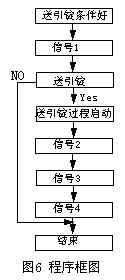 根據(jù)光檢測(cè)電裝置的工作過(guò)程,只要現(xiàn)場(chǎng)測(cè)定送引錠過(guò)程中各個(gè)光電信號(hào)發(fā)生的時(shí)間,結(jié)合送引錠過(guò)程與光電信號(hào)的關(guān)系,利用PLC應(yīng)用程序中的相關(guān)數(shù)據(jù),編制符合要求的PLC程序,將PLC程序輸出信號(hào)輸入至PLC的輸入模塊,替代原光電信號(hào)的輸入信號(hào)。其程序框圖如圖6所示。