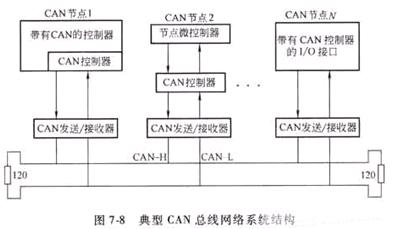 CAN總線系統結構:CAN總線每個節點需要帶有CAN協議控制芯片及適當的接口電路,節點之間通過雙絞屏蔽線進行總線式連接,首尾節點需要接120R的匹配電阻,通信最高速率可達1MBPS,傳輸速率越低,傳輸距離越遠。系統結構如下: