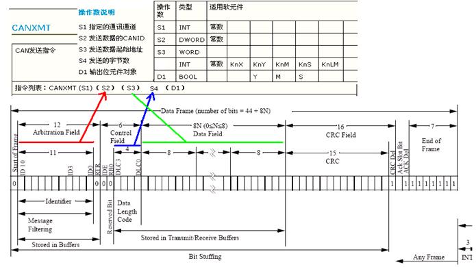 2)數據發送:使用指令CANXMT,并以CAN2。0A協議為例描繪了它們之間的對應關系。