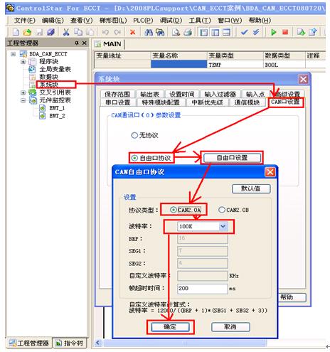 1)基本設置:在工程管理器里雙擊“系統塊”,在彈出的窗口選擇“CAN口設置”,在“CAN口參數設置”里選擇“自由協議”,然后單擊后面的“自由口設置”按扭。在彈出的窗口選擇協議類型“2.0A”或“2.0B”,然后再下拉選擇“波特率”最后單擊“確定”,把系統塊下載到