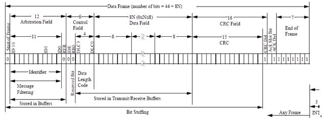 然后是由11位標識符(ID10-ID0)(擴展格式為29位(ID10-ID0,EID17-EID0))和遠程發送請求位 (RTR)組成的仲裁場。RTR位標明是數據幀還是請求幀,在請求幀中沒有數據字節。