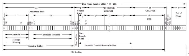 標準格式和擴展格式唯一的不同是標識符(ID)長度不同,標準格式為11位(ID10-ID0),擴展格式為29位(ID10-ID0,EID17-EID0)。