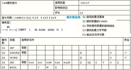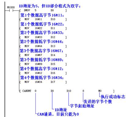 其中要注意的是:1)CANXMT為上升沿執行指令,M1000為指令執行條件,當其出現OFF—>ON的變化時,執行CANXMT指令;2)使用CANXMT指令前先把該賦值的地址寫好;3) 發送數據只取D元件的低8位; 4)網絡上沒有CANID、數據完全相同的CAN幀同時出現;5)ID保留0。6)CAN程序的校驗部分全部由硬件自動完成,用戶程序不需要參與。