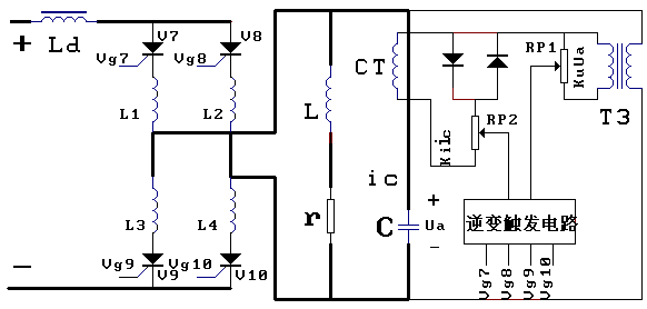 Ld使整流橋輸出的直流電流連續(xù),電流紋波減小,這樣可近似地把整流橋輸出電流看成一平直電流。Ld的另一個(gè)作用是限制中頻電流進(jìn)入工頻電網(wǎng),起隔離作用;當(dāng)逆變失敗時(shí),它也起限制浪涌電流的作用。