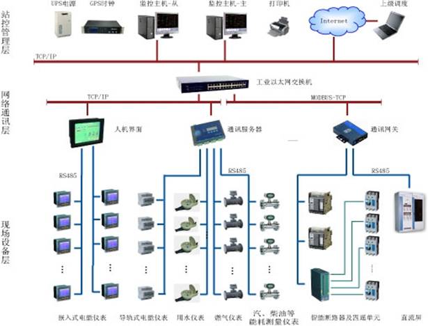 站控管理層針對能耗監測系統的管理人員,是人機交互的直接窗口,也是系統的最上層部分。主要由系統軟件和必要的硬件設備,如工業級計算機、打印機、UPS電源等組成。監測系統軟件具有良好的人機交互界面,對采集的現場各類數據信息計算、分析與處理,并以圖形、數顯、聲音等方式反映現場的運行狀況。