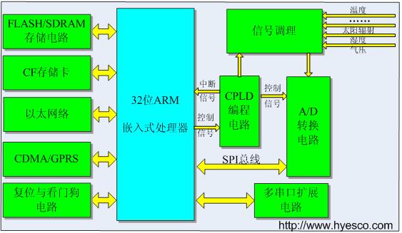 | 恒頤氣象信息數據采集控制系統主要包括以下幾個部分:ARM控制器、存儲電路、CPLD邏輯編程電路、A/D通道選擇電路、電源電路、信號調理電路等。系統硬件結構示意如圖2所示: |