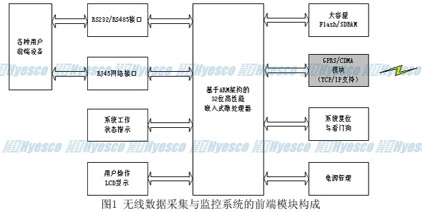 | 圖1為無線數據采集、傳輸與監控系統的前端模塊構成: |