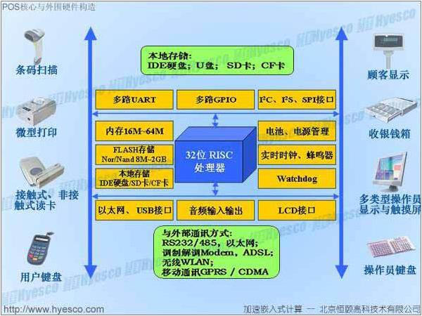 在金融、商業、以及其他各種行業,存在大量的交易處理型計算,其信息化與智能化持續地產生著新的需求,推動著人們去創造各種解決新問題、任務獨特、高效便捷的專業POS終端。 縱觀行業發展,新形勢要求POS終端在計算速度方面、多任務處理方面、安全加密方面、人機交互方面、移動便攜、及降低能耗方面比以往有更大的提升。為此,需要有更先進的軟硬件平臺解決方案。 微處理器作為整個POS終端設備的“心臟”,其性能和功能的提升為重中之重。觀察和實踐證明,基于傳統MCU的POS計算正經歷著向32位嵌入式RISC處理器升級的過程。32位RISC處理器由于內嵌了多種功能模塊,顯現出特別的適用性。北京恒頤www.hyesco.com憑借長期對嵌入式計算的專注和對相關客戶的支持服務,積累了多款面向POS終端的系統平臺解決方案。 |