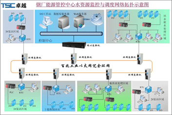 一、概述 鋼鐵企業的水系統主要通過能源動力廠下屬4個供水和處理車間(供水車間、環水車間、板坯水處理車間和綜合水處理車間)實現全場水資源的分配和處理。 水資源和監控與調度系統主要功能是將能源動力廠管轄的水源地、用戶、水庫、和管網監測點之間通過工業以太網交換機進行連接,實時地把水源、用戶、水庫和工藝設備的運行狀態參數和水壓、流量、水位和溫度等參數采集到調度中心,進行集中處理。 水系統網絡按照三層結構設計:控制中心、各監控站點,現場設備。控制中心內部采用通用的Ethernet作為系統的骨架,構建10/100M的網絡。采用卓越TSC工業以太網三層交換機組建整個網絡的數據交換中心,與外部節點的連接采用工業冗余光纖網絡。 二、網絡拓撲示意圖