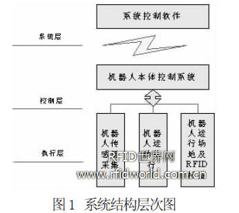光電與RFID 導(dǎo)引物流機(jī)器人系統(tǒng)是三層架構(gòu)的系統(tǒng), 分為系統(tǒng)層、控制層和執(zhí)行層。由系統(tǒng)控制軟件系統(tǒng)、機(jī)器人本體控制系統(tǒng)、機(jī)器人傳感器采集、機(jī)器人運動執(zhí)行、機(jī)器人運行場地及RFID 標(biāo)簽、無線通訊鏈路等組成。系統(tǒng)結(jié)構(gòu)層次圖如圖1 所示。