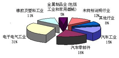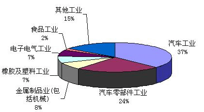 圖1: 2005年美洲地區各主要行業對工業機器人需求比例分布圖