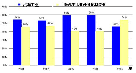 圖3: 2001-2005年歐洲地區汽車工業對工業機器人需求占所有工業對工業機器人需求比例變化圖