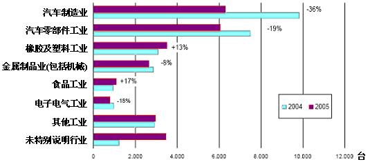 圖4: 2004-2005年歐洲地區各主要行業對工業機器人需求情況變化圖
