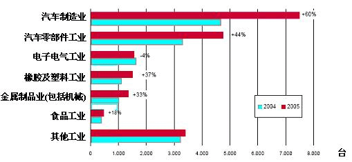 圖5: 2004-2005年美洲地區各主要行業對工業機器人需求情況變化圖