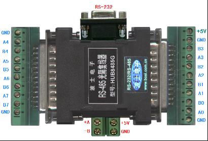 HUB8485G 的上位機的RS-232是一個標準的DB-9插頭、可以直接外插或通過延長線接標準的計算機的DB-9 針RS-232 口。 HUB8485G 的上位機的RS-485是接線端子,注意上位機RS-485的地線同電源的GND是一樣的。HUB8485G需要加兩個相互隔離的5V電源,廠家已經隨產品配套贈送。雖然相比舊款的產品增加了功能、改善了外形,但是新的HUB8485G的價格一分錢都沒有增加。