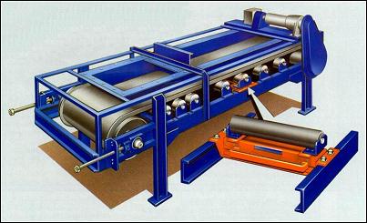 稱重給料機系統主要包括:秤架(包括安裝支架)、稱重傳感器、速度傳感器、手動掛碼校驗裝置、防跑偏措施、頭部刮板、內清掃、拉緊裝置、配料秤的密封罩、支撐架、膠帶、托輥、輥筒、結構件(卸料端帶有襯板的卸料漏斗、拖料端帶拖料漏斗及手動調節門等)、變頻調速電機、接線盒及連接電纜(稱重傳感器之間)、通訊連接設施(稱重給料機系統)、數字顯示表、標定及調校設施、成套儀表盤等(如圖2)。 稱重給料機的核心部分是 皮帶秤(如圖3)。 皮帶秤的主要組成由秤架、積算儀和速度傳感器組成;而稱重給料機系統的結構特點和精度主要由皮帶秤的設計結構決定。