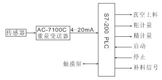先在觸摸屏上設定好配料的目標量和補料的目標量,啟動第一次配料,真空上料機往稱重斗中加料到第一次補料的目標量,關閉真空上料機。稱重斗打開配料閥門,開始粗配料(加料到