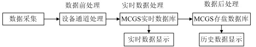 在現(xiàn)代化的工業(yè)生產(chǎn)現(xiàn)場,由于大量使用各種類型的控制設(shè)備,因此,通常會產(chǎn)生大量的生產(chǎn)數(shù)據(jù)。這就要求構(gòu)成控制系統(tǒng)核心的組態(tài)軟件具備強(qiáng)大的數(shù)據(jù)處理能力,從而有效、合理地將這些生產(chǎn)數(shù)據(jù)加以處理,一方面,為現(xiàn)場操作員提供實時、可靠的圖象、曲線等,以反映現(xiàn)場運(yùn)行的狀況并方便其進(jìn)行相應(yīng)的控制操作;同時,也需要為企業(yè)的管理人員提供各種類型的數(shù)據(jù)報表,為企業(yè)管理提供切實可靠的第一手資料。通過MCGS組態(tài)軟件可以完成數(shù)據(jù)的初步處理,該組態(tài)軟件將數(shù)據(jù)處理過程分為三個階段,即:數(shù)據(jù)前處理、實時數(shù)據(jù)處理以及數(shù)據(jù)后處理,以滿足各種類型的需要,如下圖2所示: