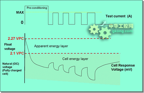 起初,這個單一的較長預處理脈沖動作在開始繪制測量脈沖之前,把電芯帶入正確的“能量層”狀態。后者生成不同的電芯電壓響應,結合脈沖電流參照值,提供阻抗值。