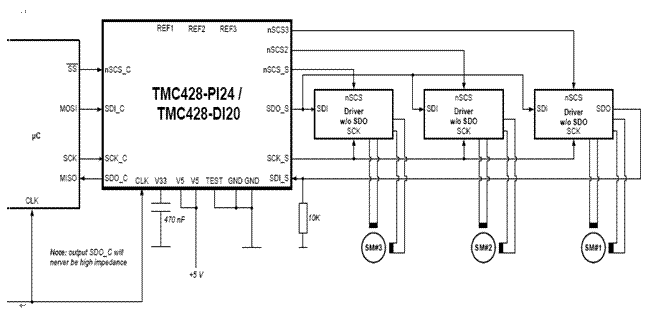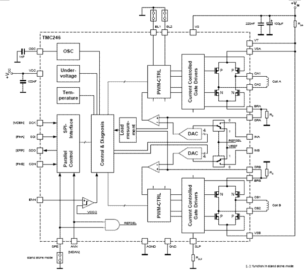 TMC246通過串行總線SPI控制。通過SPI數據設置兩相線圈的電流和極性,通過接收到的數字描述正弦波和余弦波,TMC246可以輸出微步脈沖控制電機,每個微步都是根據SPI的數據產生,如果配合使用TMC428(3軸控制芯片)可以自動產生SPI指令和控制電機的波形,實現3軸電機的控制。
