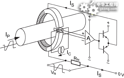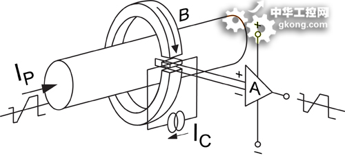 相比之下,閉環(huán)傳感器,也叫霍爾效應(yīng)補償式或“零磁通式”傳感器,它利用霍爾元件電壓在次級線圈中產(chǎn)生一個補償電流,從而使總磁通量等于零(圖2 )。換而言之,次級電流Is產(chǎn)生的磁通量與初級電流產(chǎn)生的磁通量完全相同,不過方向相反。