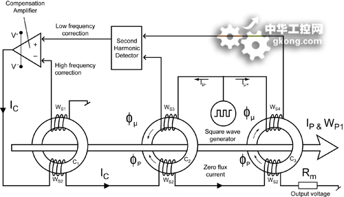 圖3詳細說明了其工作原理。該傳感器包括一個由三個磁芯(C1、C2和C3,)以及初級繞組(Wp1)和次級繞組(Ws1 - Ws4)組成的電流測量頭,如圖所示。通過將次級電流Ic注入次級繞組Ws2中實現(xiàn)閉環(huán)補償。Ws2后半段線圈與3個磁芯進行磁耦合,并與測量電阻Rm串聯(lián),從而產(chǎn)生一個輸出電壓。