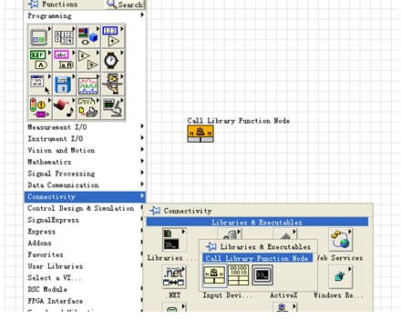 LabVIEW 中是通過Call Library Function Node(CLN)節點來完成DLL文件調用的。創建一個新的VI,右擊程序框圖,在Functions Palette中依次選中Connectivity——Libraries&Executables工具欄即可找到該節點(圖1)。