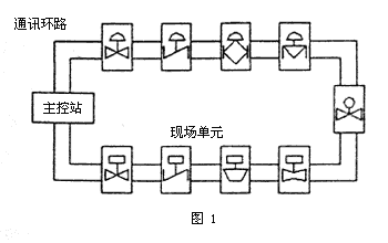 不同的閥門執行器現場總線控制系統在結構上是基本相同的。它們一般是由主控站、通信環路和現場單元(本體為閥門或執行器)組成。系統結構框圖如圖1所示。