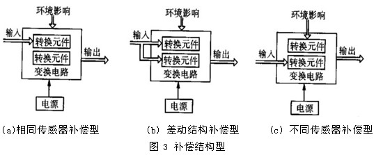 相同傳感器補償型(圖3-a)是使用兩個完全相同的轉換元件置于同樣環境下的構成形式。實際使用其中一個元件進行工作,另一個用于抵消其受到的環境干擾影響。常見的有應變式,固態壓阻式傳感器等。